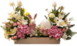 Összetétel: élethű dekor virágok, porcelán húsvéti tojás és nyuszi figura, díszítő zöldek, fehér fa dekor láda.