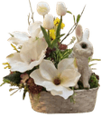 Összetétel: élethű dekor virágok, valósághű nyuszi figura, díszítő zöldek és gallyak, fehér fonott kosár.
